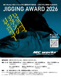 JIGGING AWARD2026開催 2025/12/01 お待たせいたしました! 今年も開催いたしますJIGGING AWARD2026。 今年は2025年12/1からの受付開始で2026年5月31日までの期間の開催となっております。基本的なルールやエントリーメソッドは昨年同様です。ぜひ奮ってご参加お願い致します!!